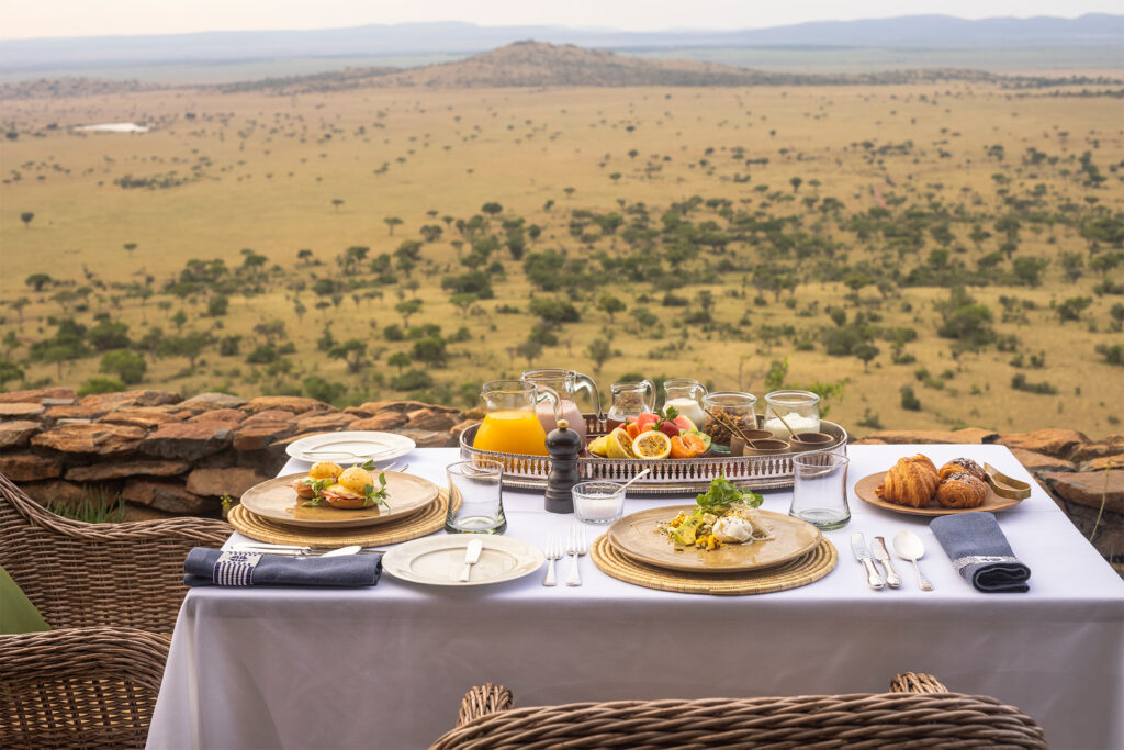Ngorongoro Crater Lodge terrace with table and green scenery in front