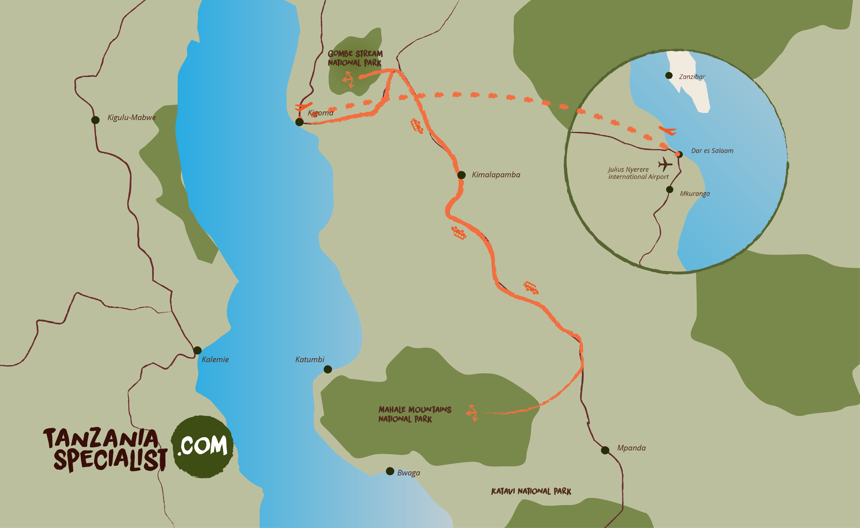 Dette er en perfekt safarikombination, hvis du drømmer om at opleve chimpanserne i det vestlige Tanzania på nært hold. Gombe Stream National Park er det berømte sted, hvor Jane Goodall forskede i chimpansepopulationer. Parken ligger på den vestlige grænse mellem Tanzania og Congo og består af 35 km² beskyttet land langs bakkerne på Tanganyikasøens østlige bred. Mahale Mountains National Park ligger tæt på, syd for byen Kigoma. Mahale Mountains er det eneste sted, hvor chimpanser og løver lever side om side.